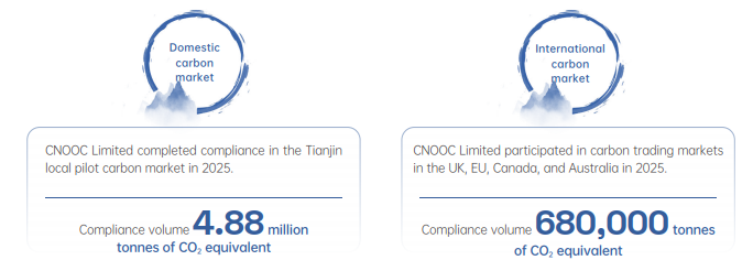 Domestically, CNOOC Limited completed compliance obligations in the Tianjin local pilot carbon market, leveraging green electricity offset policies to reduce compliance costs. Internationally, CNOOC Limited fulfilled carbon compliance obligations in accordance with local carbon market regulations in the United Kingdom, Canada, and Australia.