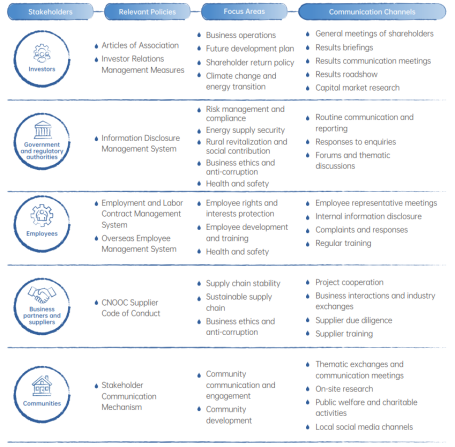 CNOOC Limited continues to strengthen its two-way communication mechanisms with stakeholders and actively builds an open, transparent, diversified and ever-improving communication system. We proactively engage in in-depth dialogue with stakeholders on a wide range of ESG-related topics, dynamically identify stakeholders’ core concerns and value expectations, and comprehensively assess the impacts of the Company’s operations on stakeholders, with particular attention to the needs and expectations of vulnerable groups. On this basis, we continue to enhance our ESG management system. We further deepen cooperation with stakeholders by formulating and implementing targeted community engagement plans and social well-being improvement strategies. Through responsible investment and concrete actions, we promote the sustainable development of communities and contribute to improving people’s well-being, social harmony, and prosperity.