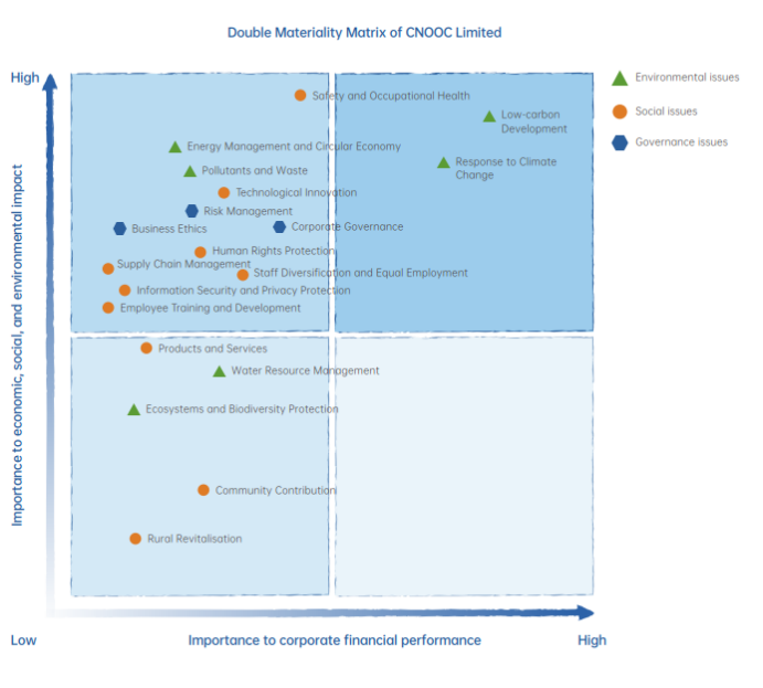 According to the materiality requirements of the Environmental, Social and Governance Reporting Code issued by the SEHK and in response to the requirements of the Guidance on Self-Regulation of Listed Companies on the Shanghai Stock Exchange No. 14 -- Sustainability Report (Trial), CNOOC Limited has comprehensively met the expectations of shareholders, customers, employees, and other stakeholders. In 2024, the Company completed the identification of double materiality issues1. During the reporting year, building on the 2024 assessment, the Company further adjusted and optimised the prioritisation of ESG issues in terms of both impact materiality and financial materiality, taking into account external trends and the results of internal research.