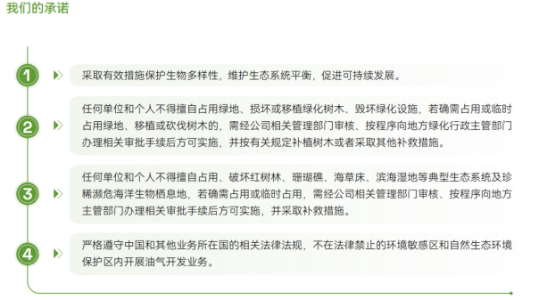 中国海油严格遵守《中华人民共和国海洋环境保护法》《乌干达环境保护法》等各运营地法律法规,持续完善内部管理制度。公司制定《生态环境保护管理办法》《生态保护与污染防治管理细则》《质量健康安全环保合规管理细则》《上游海上项目环境影响评价及海域使用管理细则》一系列内部制度,并在本年度修订《建设项目安全环保“三同时”管理细则》,确保业务活动符合环保法规。在项目运营过程中,通过应用环保技术和措施,最大程度减少对当地生态系统的影响,致力于实现环境友好与生态平衡。