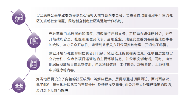 中国海油尊重当地居民的风俗习惯和文化传统,致力于尊重、捍卫和保护人权,重视生态环境保护,承诺不在保护区内作业,最大限度减小公司运营给当地社区带来的不良影响。公司遵循自由自愿、事先知情的认可权﹙FPIC)原则,积极开展社区沟通工作,协同当地政府、非政府组织、社区代表等,建立多样化沟通渠道,通过对话、申诉解决程序和社区影响管理措施,充分了解当地居民对于公司开展生产建设活动的看法与建议,及时评估项目对于社区的影响,识别社区相关潜在风险与机遇。